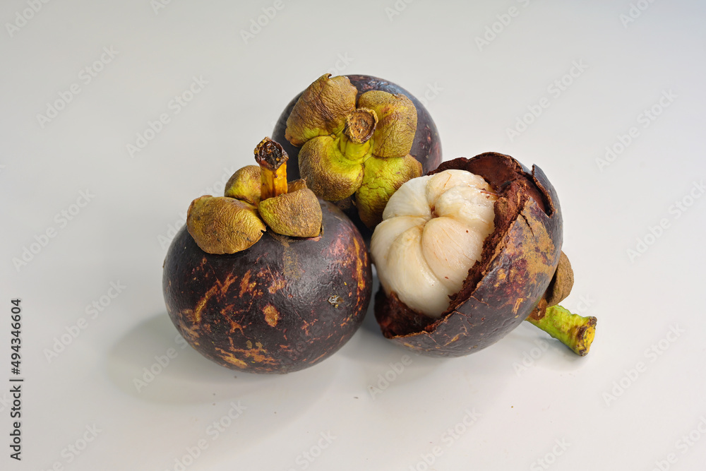 Half Of An Open Mangosteen Garcinia Mangostana And 2 Ripe Whole Fruits On White Background Stock Photo Adobe Stock