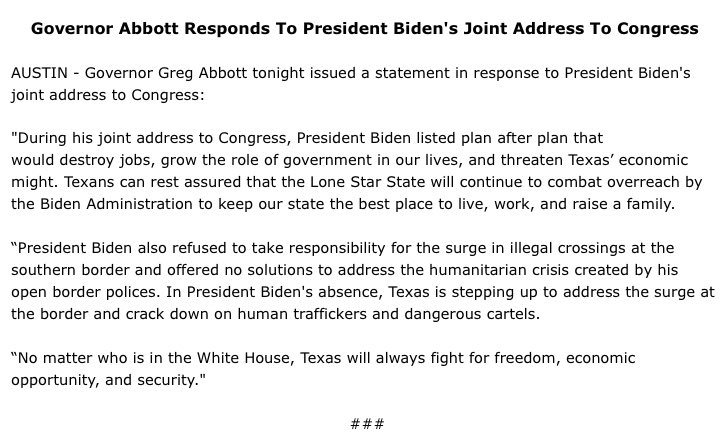 Gov Greg Abbott On X Response To President Biden S Joint Address To Congress Https T Co Hkry2thaww X